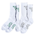 バックにジャガード織りのBEACHED DAYSロゴがポイントのソックスです。 足裏にもBD顔マークを配し、見えない部分の遊びも◎。 2足セットで白をベースに、ロゴがグレーとグリーンの2足セットになっています。 リブはしっかりとフィット感があり、つま先かかとはふんわりクッション性ある厚みになります。